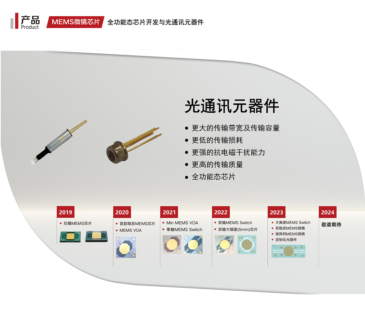 此外公司自研國(guó)產(chǎn)化的全系列光通訊MEMS微鏡芯片:VOA、SWITCH,、TOF等,從技術(shù)到產(chǎn)品的轉(zhuǎn)化過(guò)程中,團(tuán)隊(duì)逐步優(yōu)化結(jié)構(gòu)設(shè)計(jì)以提高芯片穩(wěn)定性,并設(shè)計(jì)推出了面向不同場(chǎng)景、系列化的多款產(chǎn)品,打破國(guó)外技術(shù)壟斷,以其優(yōu)異的性能給國(guó)內(nèi)器件廠家?guī)?lái)優(yōu)質(zhì)的國(guó)產(chǎn)化替代產(chǎn)品。